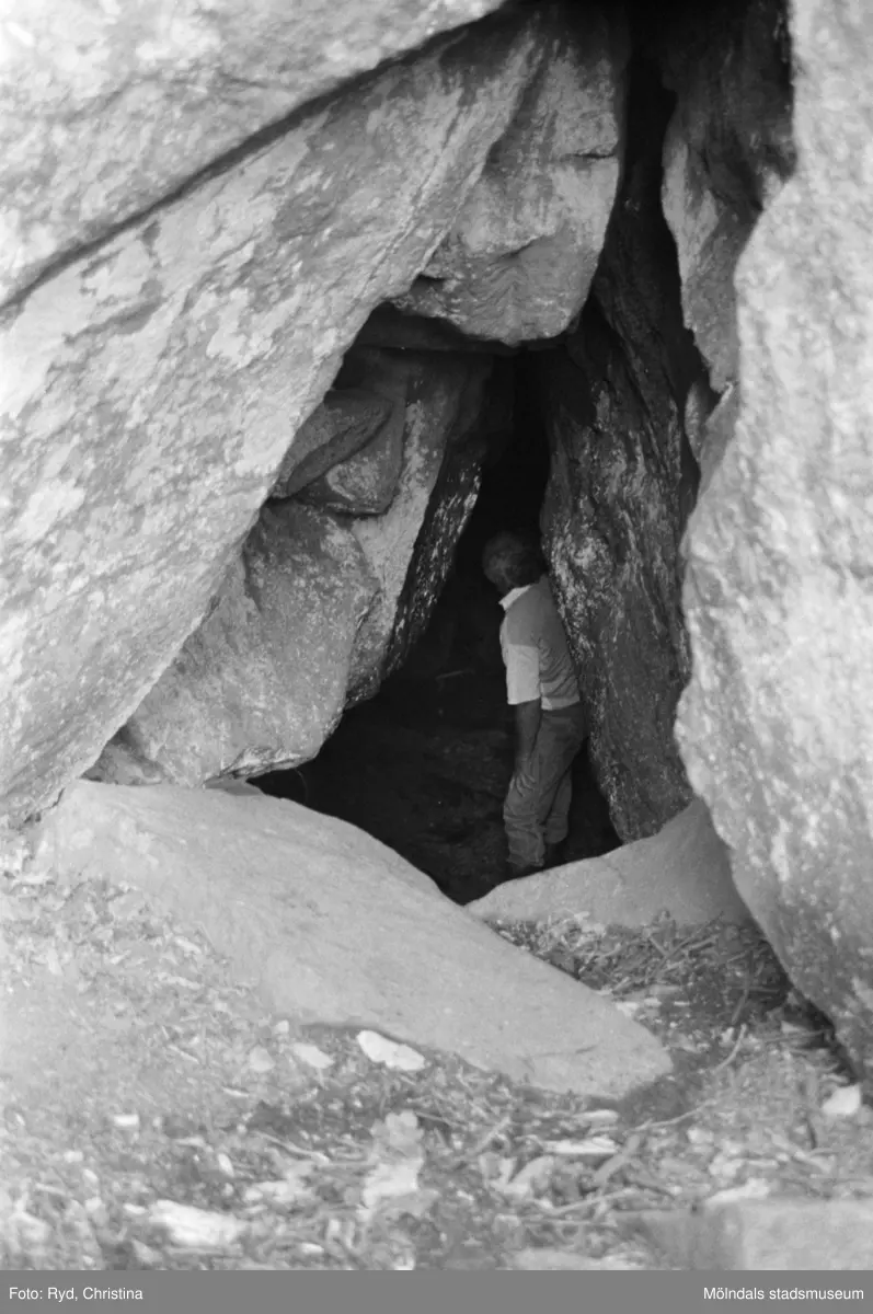 En person som står i mynningen till Börsåsgrottan, 1991.