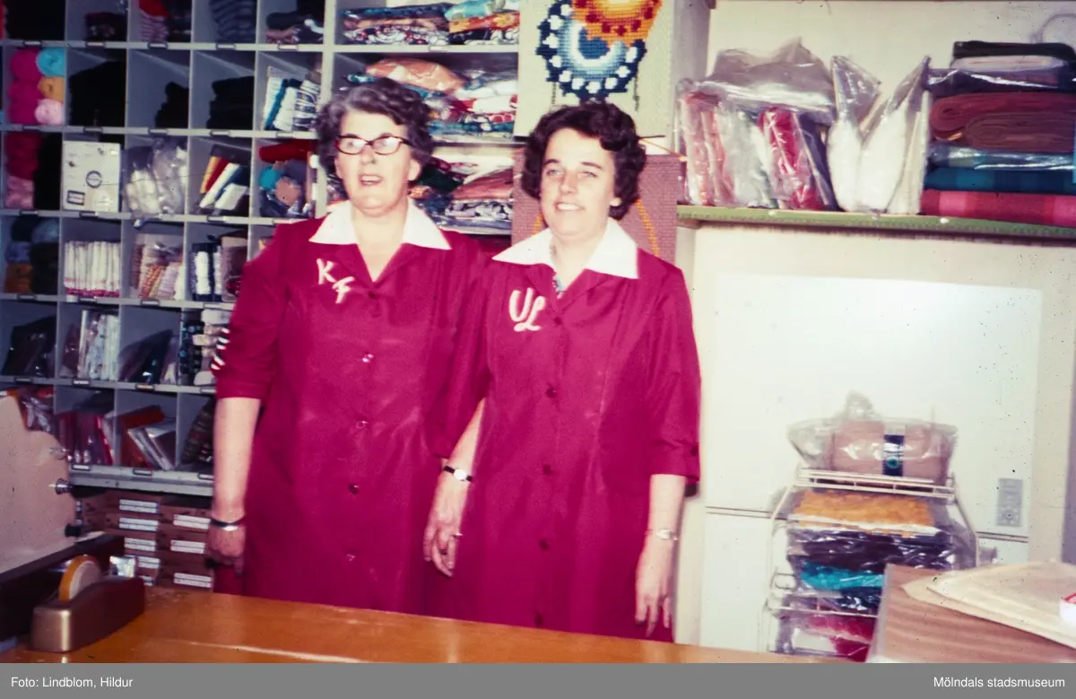 Två kvinnor fotograferade vid kassan i Kvarnbyns garn och handarbetsaffär med adress Kvarnbygatan 37 i Mölndal, 1970-tal. Till vänster ses Kajsa som var ägare av garnaffären och till höger Ulla, som senare kom att arbeta i Rasmussons skoaffär.