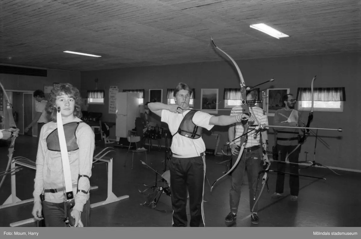 Titel: Bågskyttar i Lindome bågskytteklubb, år 1985. Fotografi taget av Harry Moum, HUM, Mölndals-Posten.
