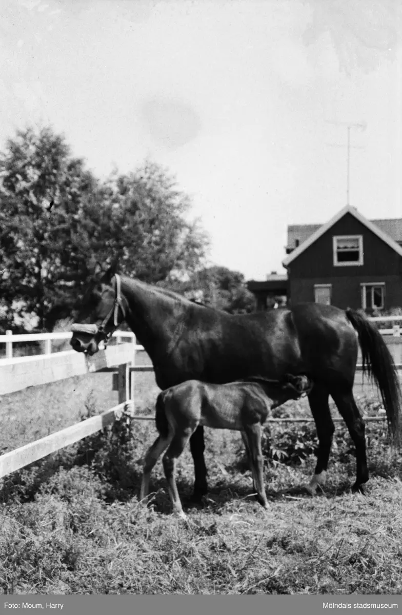 Hästen Madame Swahn med sitt föl Mr Rusticello i Lindome, år 1983.