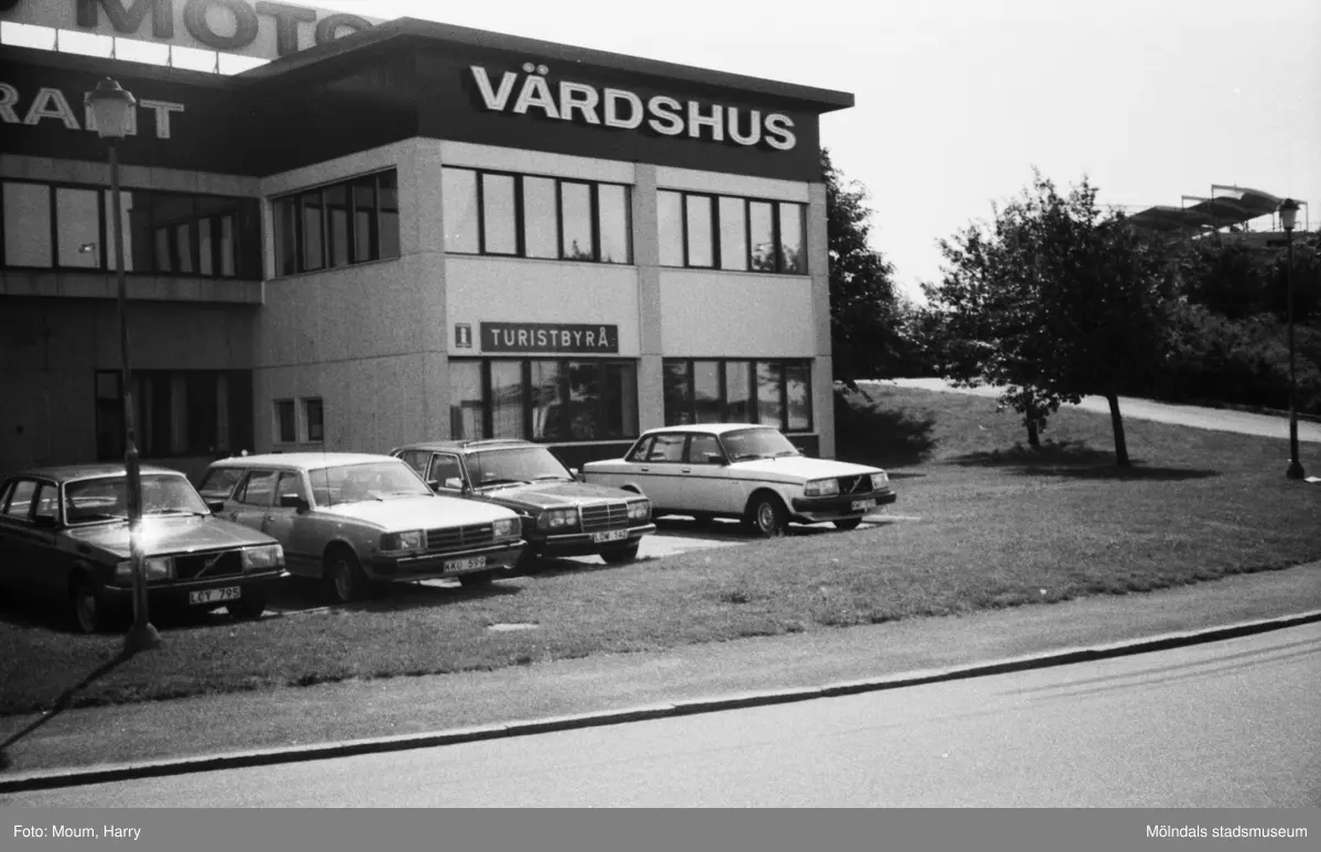 Turistbyrå i Esso Motorhotells byggnad vid Åbro industriområde i Mölndal, år 1983. Exteriören.