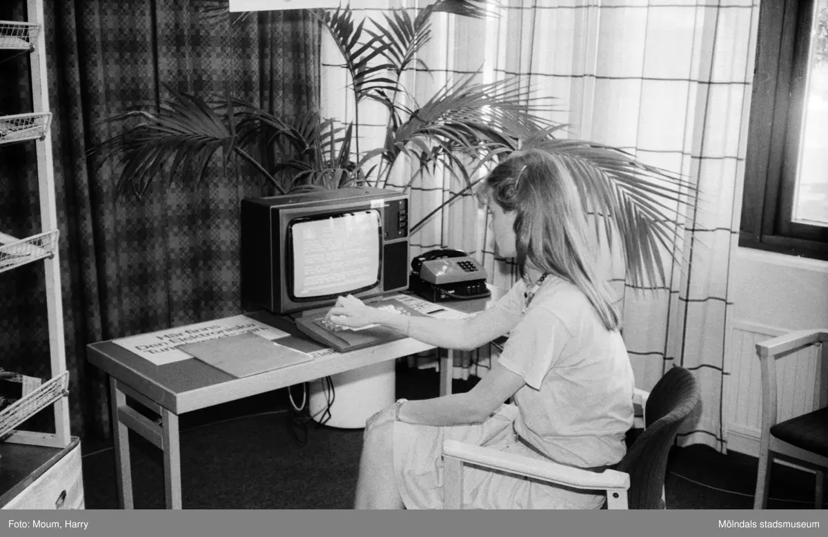 Turistbyrå i Esso Motorhotells byggnad vid Åbro industriområde i Mölndal, år 1983. Elektronisk turistguide.