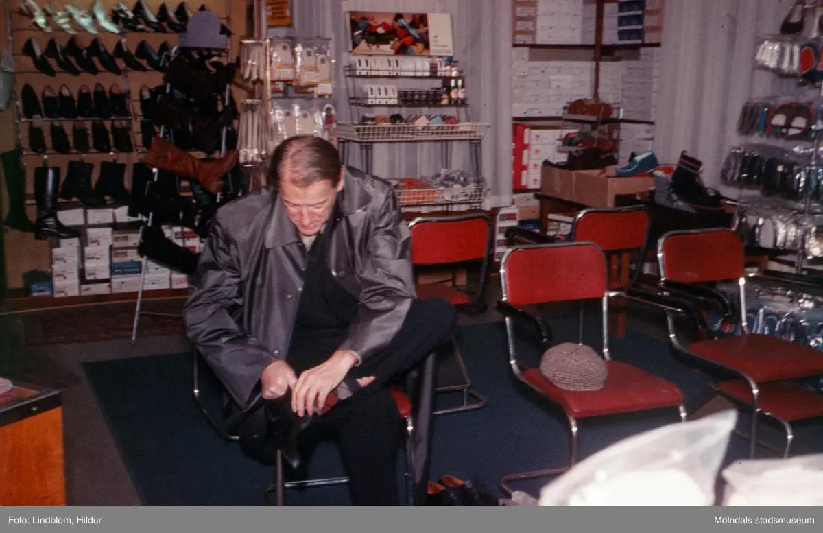 En man sitter och provar skor i Rasmussons skoaffär med adress Kvarnbygatan 4 vid Gamla Torget i Mölndal, 1970-tal.