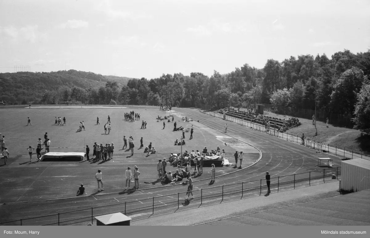 Skolmästerskap på Krokslättsvallen i Mölndal, år 1983. Vy över idrottsanläggningen.