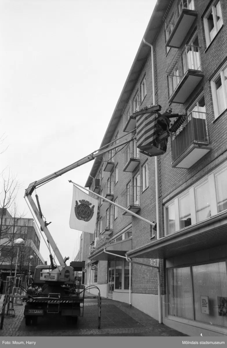 Uppsättning av blomlådor på hus vid Mölndals Torg med hjälp av kranbil, år 1985.