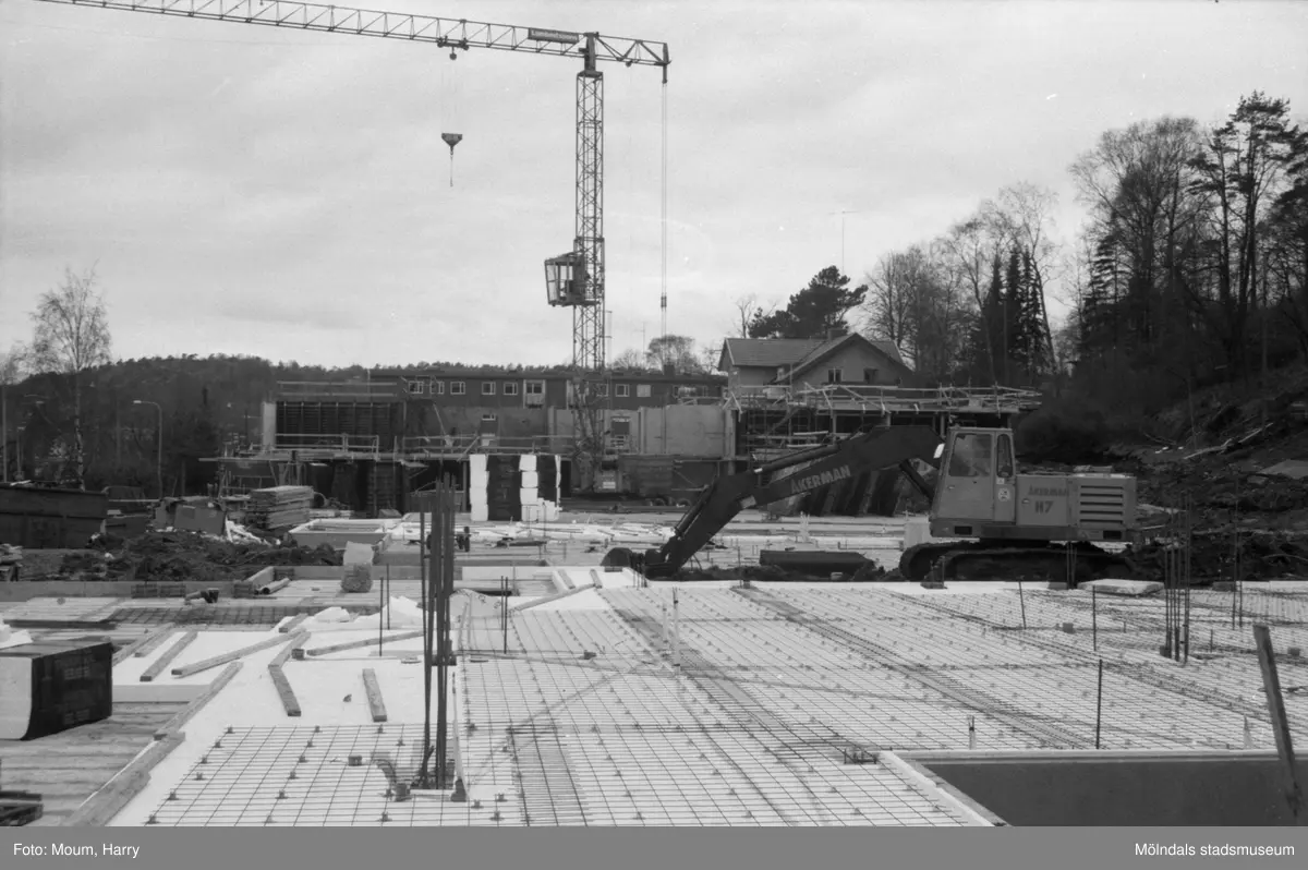 Servicehuset Brattåsgårdens äldreboende i Kållered under byggnation, år 1985. Fotografi taget av Harry Moum, HUM, Mölndals-Posten.