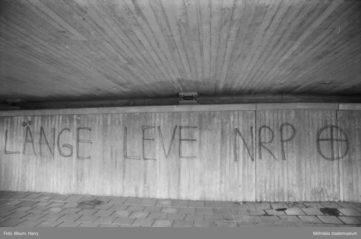 Politiskt klotter under Broslättsgatan i Mölndal, år 1984. Fotografi taget av Harry Moum, HUM, Mölndals-Posten.
