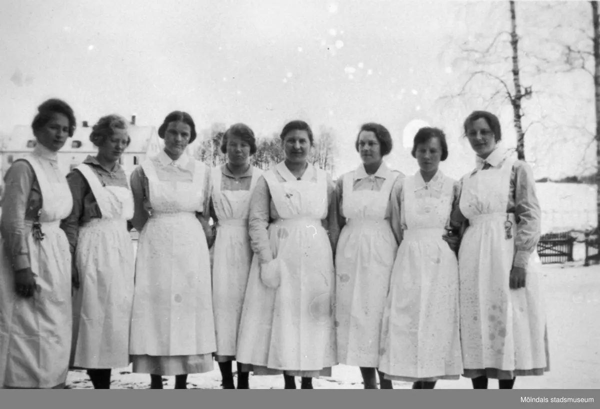 Från höger: Lilly Nilsson, Berta Jansen, Teresa Flobäck, Berta Johansson, "Dala" Svea Johansson, föreståndarinna Anna Lindström, Alfhild och Elsa Gustavsson-Olsson.
