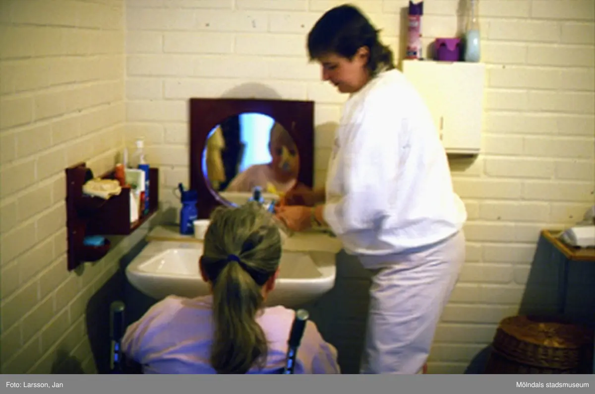En person ser sig i spegeln efter att nyligen ha blivit klippt på Stretereds vårdhem för handikappade, 1980-talet.