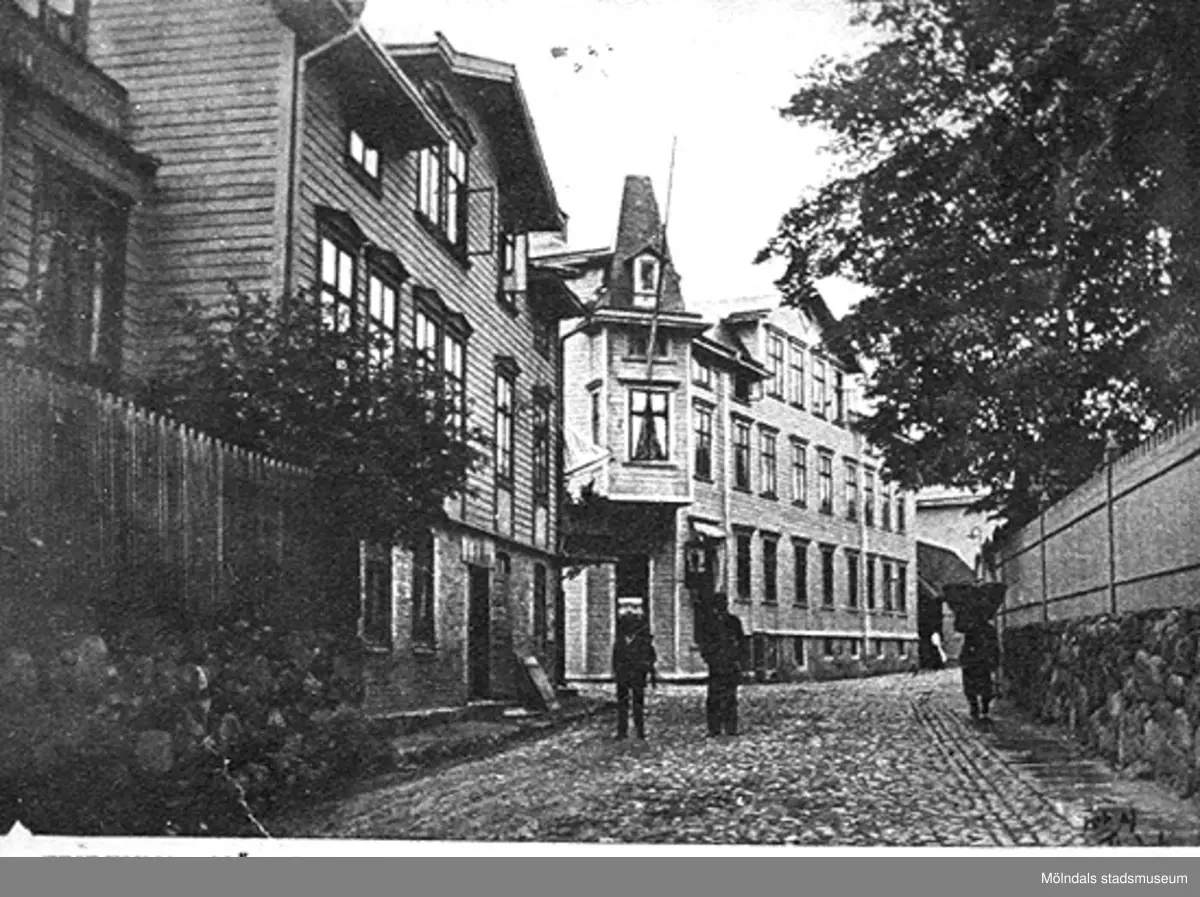 Till vänster ses byggnaderna "Eneborg" på Kvarnbygatan 23 och "Frituna" på Kvarnbygatan 25, 1930-tal. Paul Hildings kemikalieaffär låg i "Eneborg".