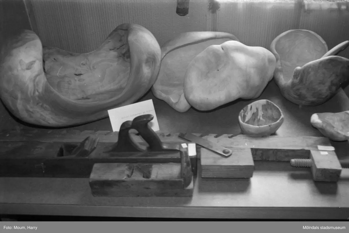 Utställning på Almåsgården i Lindome, år 1985. Vrilar (utväxter av björk) samt verktyg.