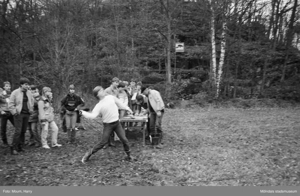 Lindome Bågskytteklubb anordnar poängpromenaden Gåsajakten i Lindome, år 1983. Stövelkastning.