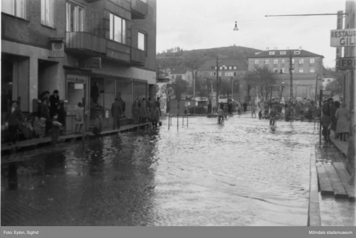 Översvämning i korsningen Kvarnbygatan-Frölundagatan samt Göteborgsvägen-Kungsbackavägen, 1951. I bakgrunden ses biografen Röda Kvarn (Kvarnbygatan 1).