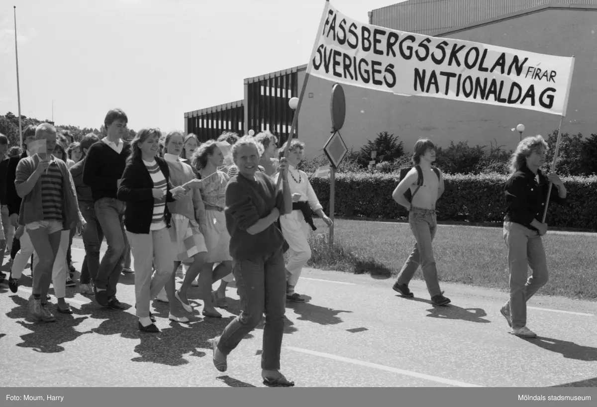 Fässbergsskolans elever firar Sveriges nationaldag i Mölndal, år 1983. Festtåg på Toltorpsgatan.
