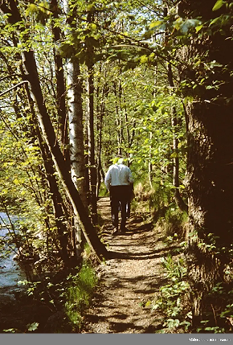 En gångstig genom skogen. Till vänster skymtas Mölndalsfallen. Samrådsgruppen promenerar i "Övre Kvarnbyn" (Bettyholm mm) 1994-05-09.