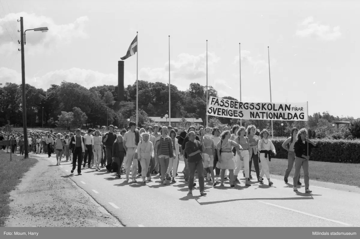 Fässbergsskolans elever firar Sveriges nationaldag i Mölndal, år 1983. Festtåg på Toltorpsgatan.