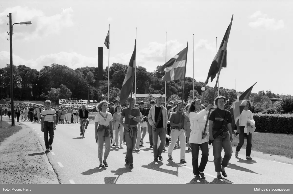 Fässbergsskolans elever firar Sveriges nationaldag i Mölndal, år 1983. Festtåg på Toltorpsgatan.