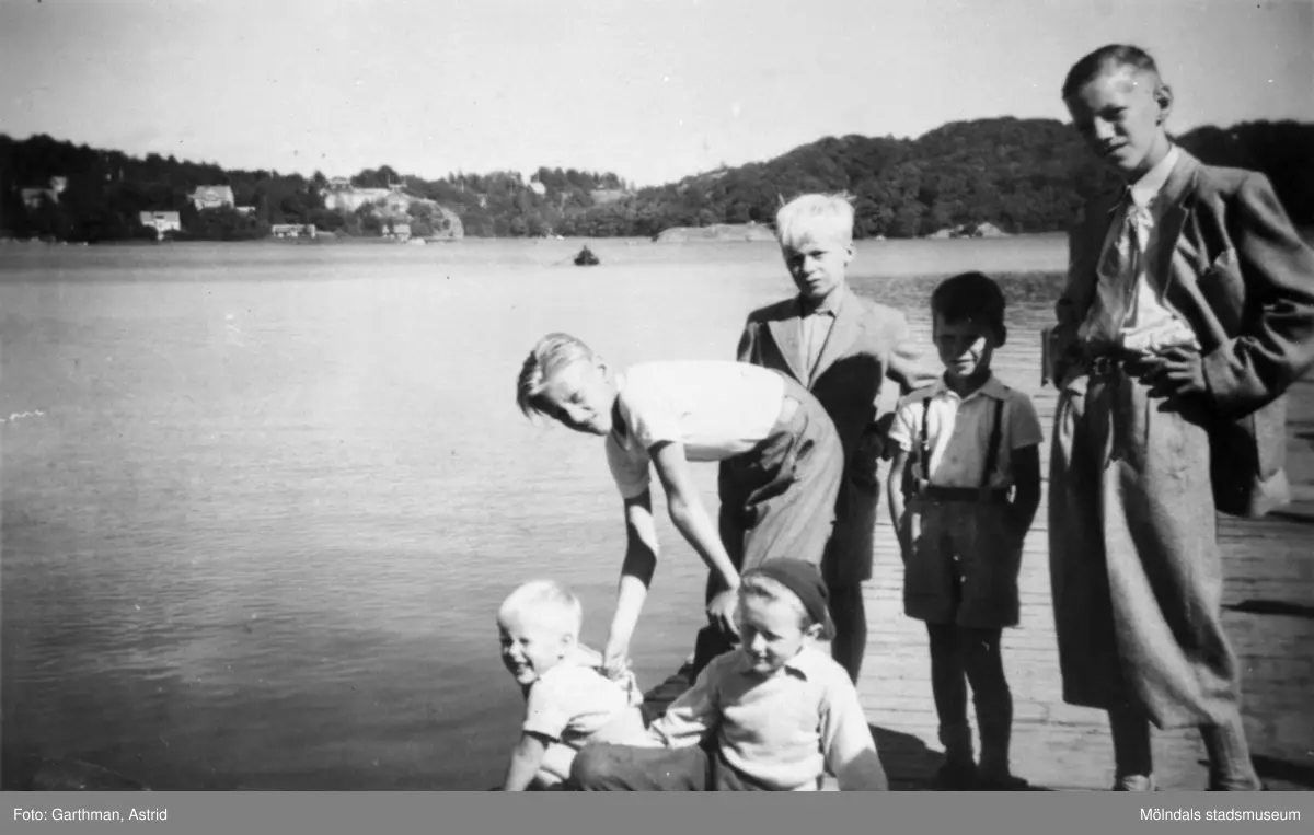 Från vänster: sittandes Alf och Leif Garthman, Rolf Karlsson (håller om Alf), Örjan och Bosse Stolt samt okänd står på bryggan vid Apels i Stensjön. Bilden är tagen under 1950-talet från Strandgatan. I bakgrunden ser man Gunnebobro och Lilla Berg.