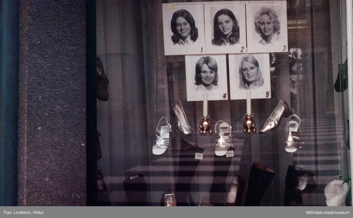 Porträtt av luciakandidater samt skor i skyltfönstret till Rasmussons skoaffär med adress Kvarnbygatan 4 vid Gamla Torget i Mölndal, 1970-tal. Affären var med och sponsrade luciatruppen.