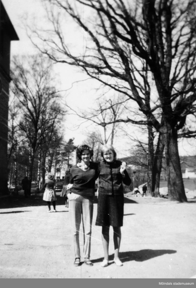 Två flickor på planen öster om Stora Skolan vid Stretereds skolhem, 1960-talet.
