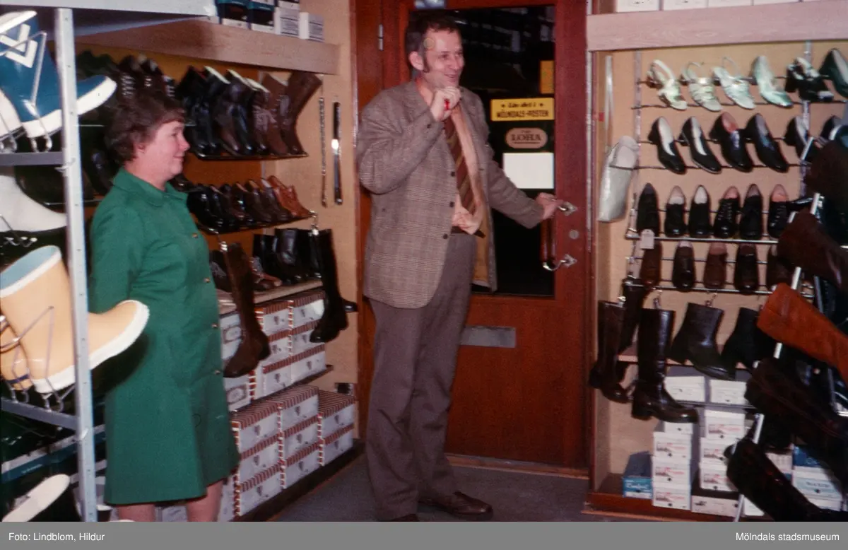 Märta Sjöberg tillsammans med en man, eventuellt försäljare, i Rasmussons skoaffär med adress Kvarnbygatan 4 vid Gamla Torget i Mölndal, 1970-tal.