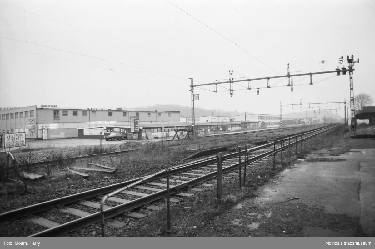 Järnvägen och bebyggelse vid Bangårdsvägen i Kållered, år 1983. Vy från Labackavägen.