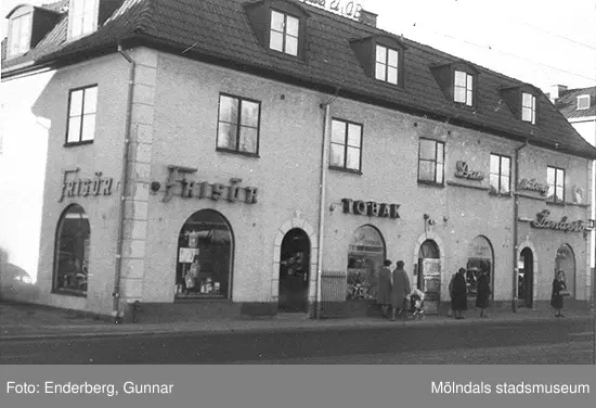 I detta hus fanns frisersalong, tobaksaffär, damsalong samt Landerö Radio och TV-affär, 1950-tal.
