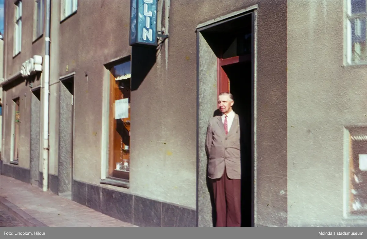 En man står i dörren till Josef Anderssons Porslinsaffär med adress Kvarnbygatan 4 vid Gamla Torget i Mölndal, 1960-1970-tal. I samma hus låg även Rasmussons skoaffär.