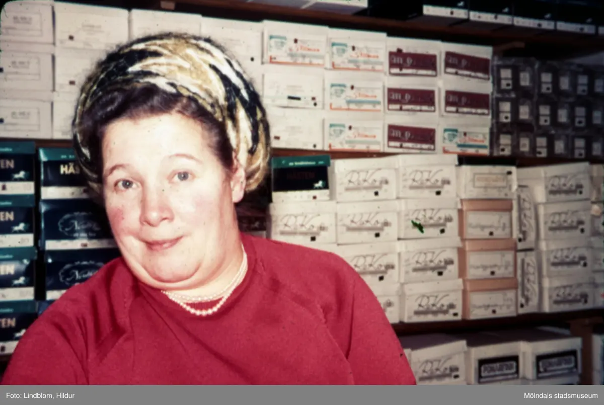Birgit, syster till Märta Sjöberg, fotograferad i Rasmussons skoaffär med adress Kvarnbygatan 4 vid Gamla Torget i Mölndal, 1970-tal.