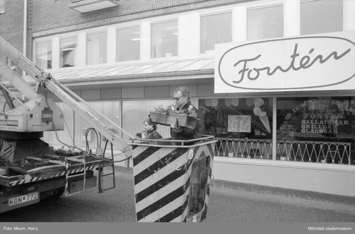 Uppsättning av blomlådor på hus vid Mölndals Torg med hjälp av kranbil, år 1985.