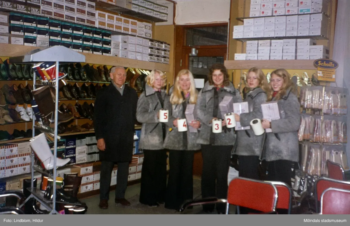 En man och fem luciakandidater i Rasmussons skoaffär med adress Kvarnbygatan 4 vid Gamla Torget i Mölndal, 1970-tal. Mannen är luciageneral Bertil Forsell. Affären var med och sponsrade luciatruppen.