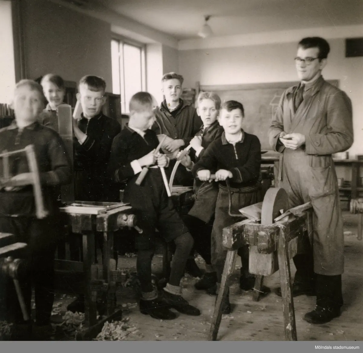 Pojkar med lärare i slöjdsal på Streteredshemmet i Kållered.