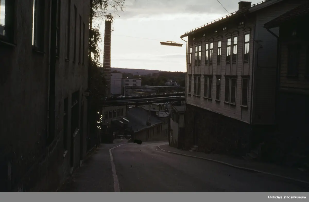 Byggnader vid "Kråkan", Kvarnbygatan, i Mölndals Kvarnby på 1970-talet.