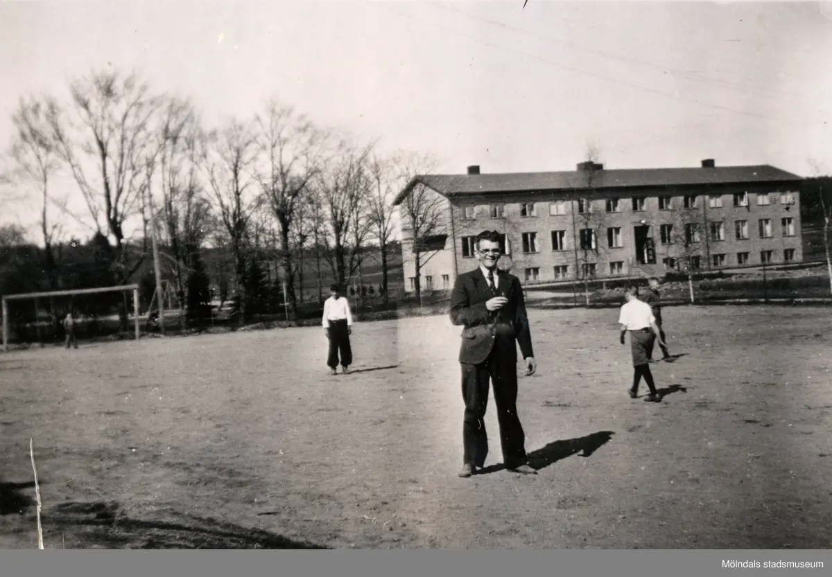 Ivar Andersson ståendes på en fotbollsplan vid Streteredshemmet i Kållered. "Ur Ivars fotoalbum."