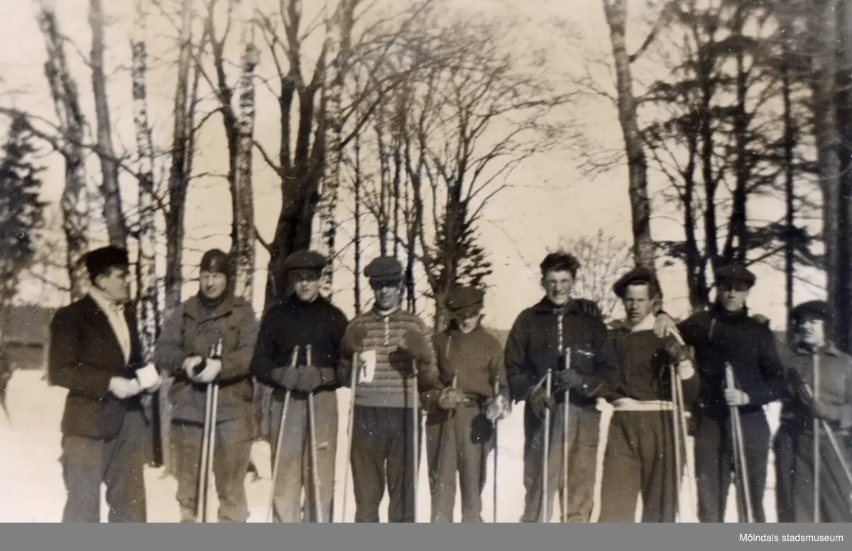 Elever från det manliga arbetshemmet på Stretered åker skidor tillsammans med ledaren Ivar Andersson längst till vänster. "Ur Ivars fotoalbum."