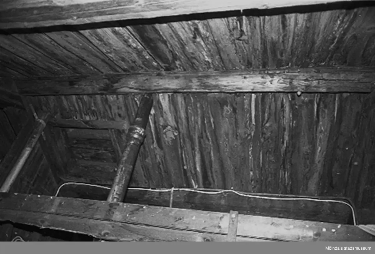 Kvarnfallet 31 i Grevedämmet, hösten 1994. Träbjälkar i innertak.