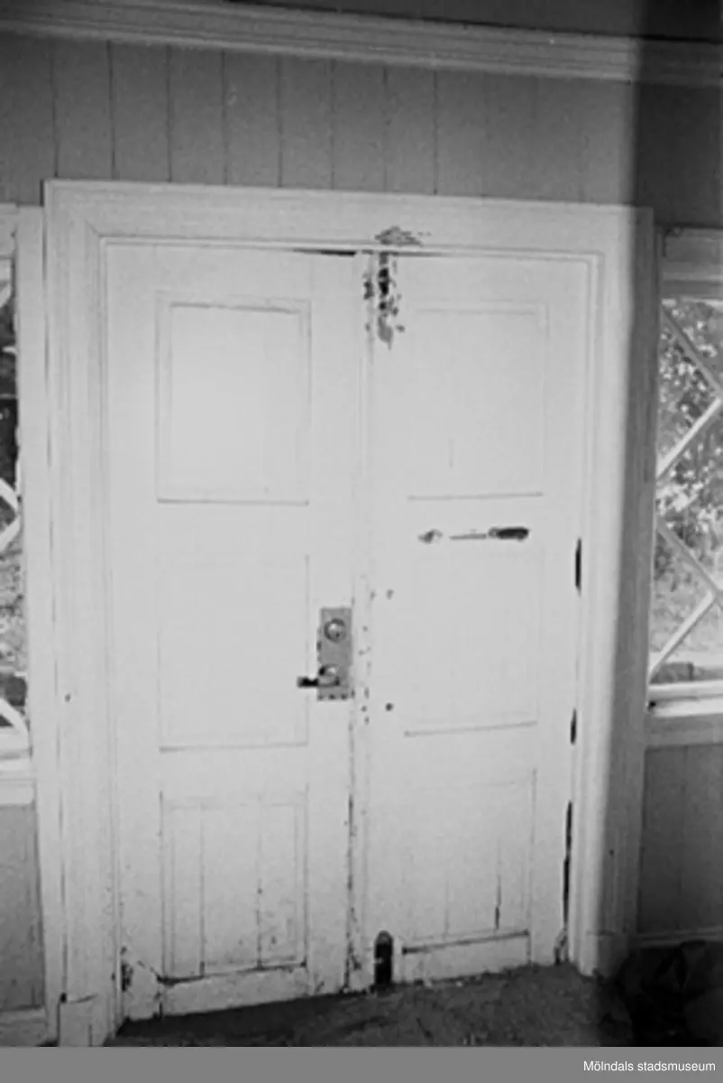Kvarnfallet 31 i Grevedämmet, hösten 1994. Interiör i fabriksbyggnad. Byggnadsdetalj: Dubbeldörr, mycket sliten.