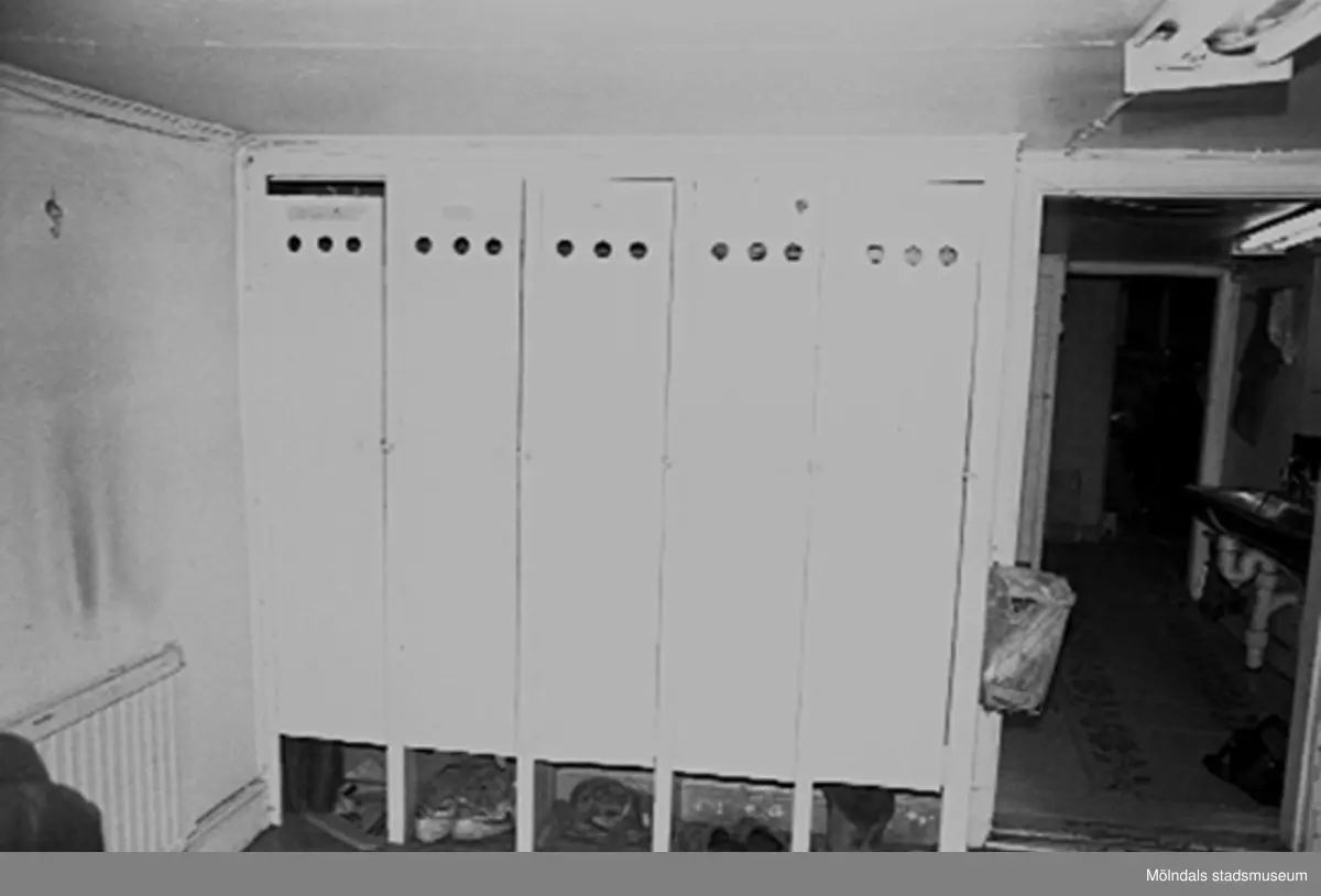 Kvarnfallet 31 i Grevedämmet, hösten 1994. Fem inbyggda omklädningsskåp med lufthål upptill. Det ligger skor under skåpen.