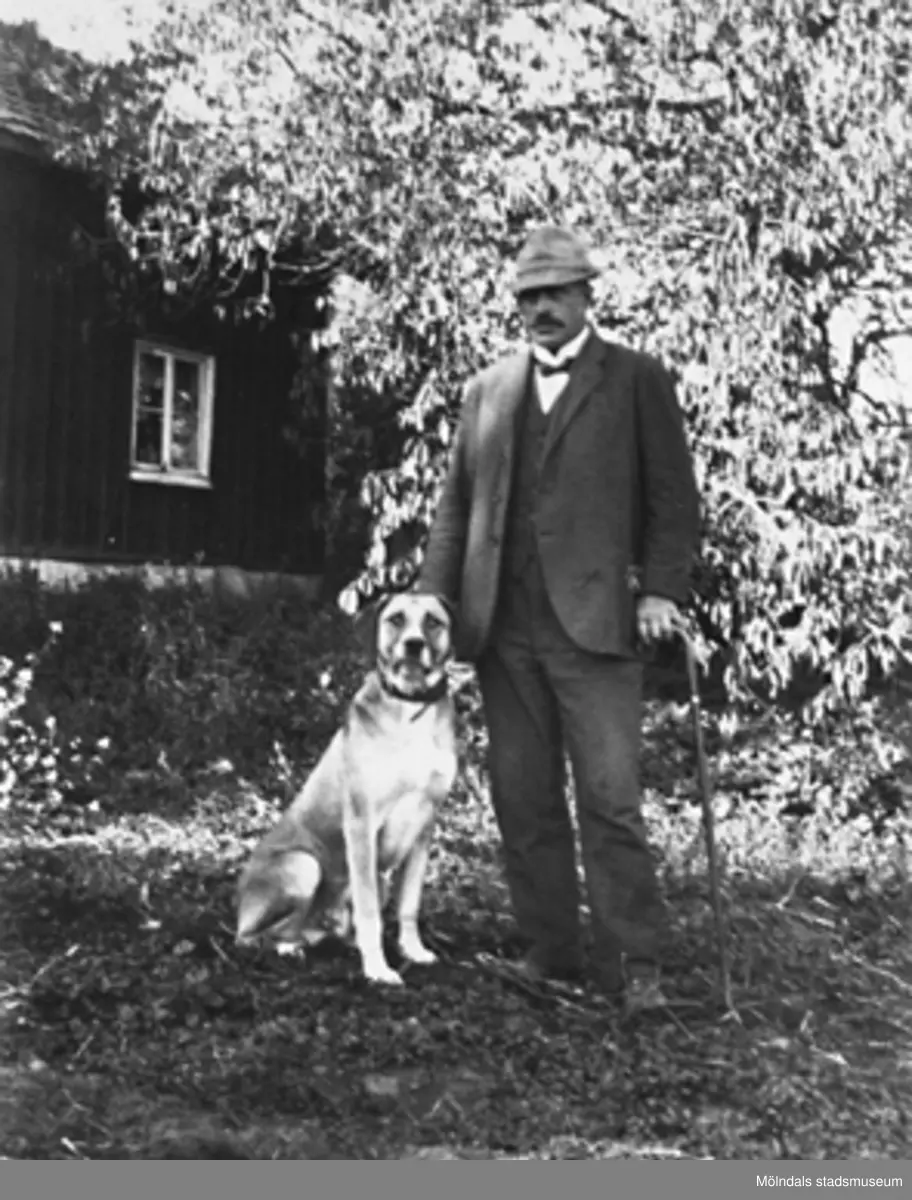 Stretered skolhems trädgårdsmästare, herr Scotte med sin hund, år 1921. Relaterat motiv: 2003_0789.