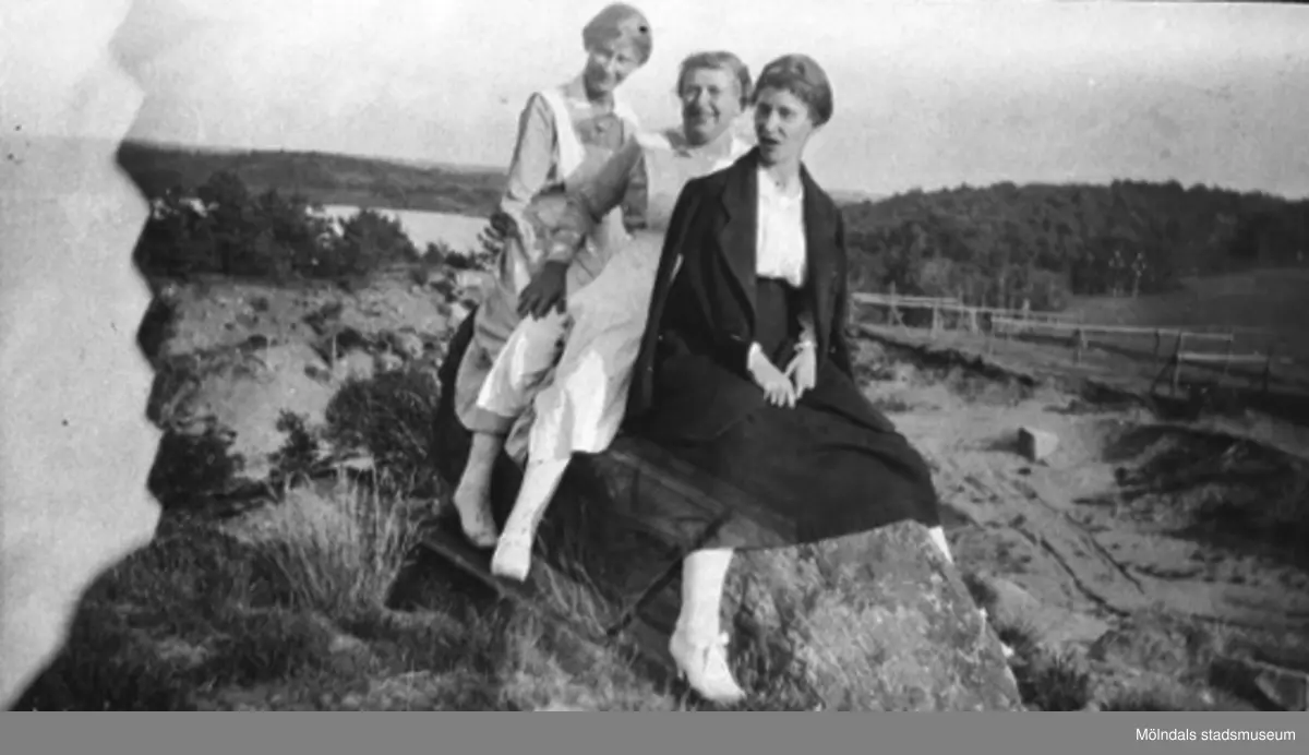 Tre sköterskor från Stretereds skolhem, sitter ovanför sandtaget vid Stretered, 1920-tal. Tulebosjön skymtar i bakgrunden.