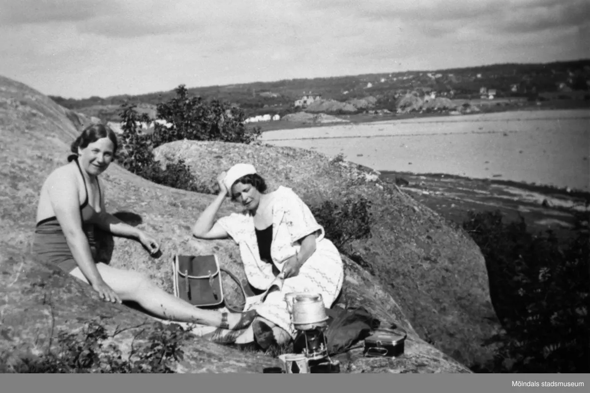 Sigrid och Alice som arbetade på Stretereds skolhem solar och badar vid Askims badvik.