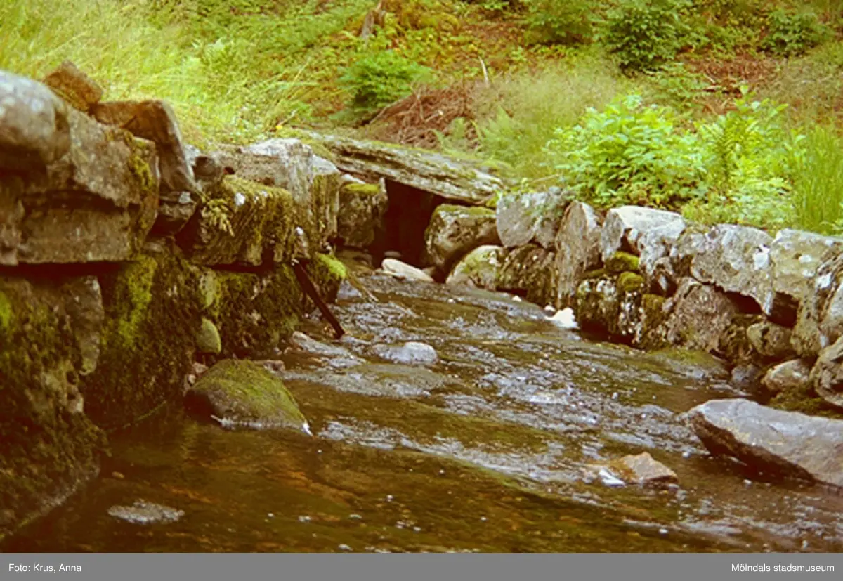 Djupedala 8:1. Detaljbild av dämme med vattenränna vid Djupedala vattenkraftverk.