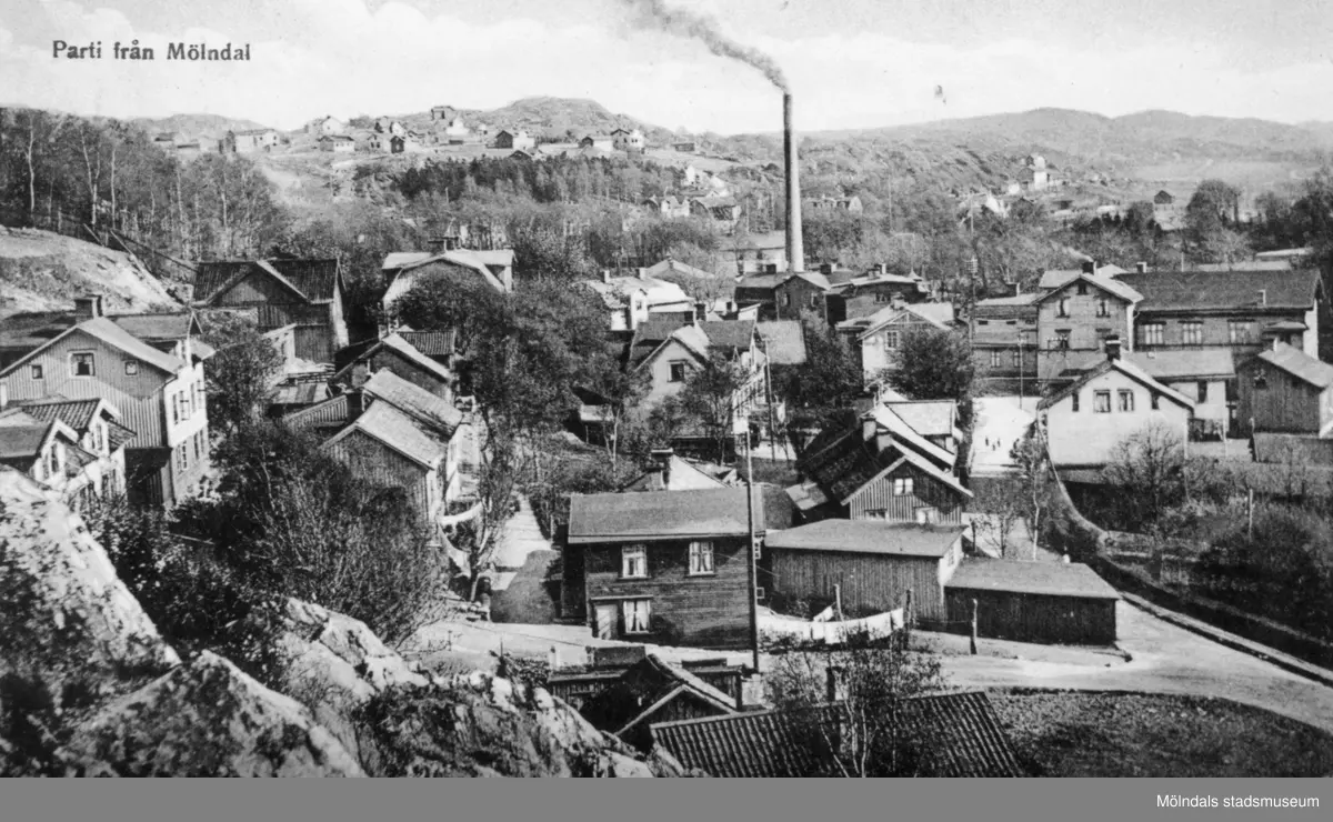 Vykort "Parti från Mölndal" stämplat 20/6 1919. Vy från Störtfjället åt söder. Till höger ses en del av Trädgårdsgatan (idag Störtfjällsgatan). Husen hade då adressen Roten G eller Trädgården.