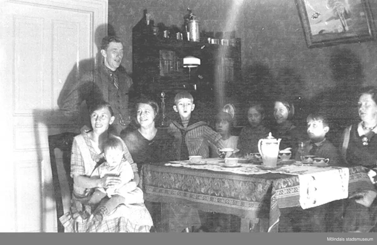 Julafton firas hemma hos familjen Karlsson på Kvarnfallet 31, 1930-tal. Från vänster Alma Karlsson med sonen Rolf i knät, Viktor Karlsson, barn samt släkt runt ett bord i vardagsrummet.