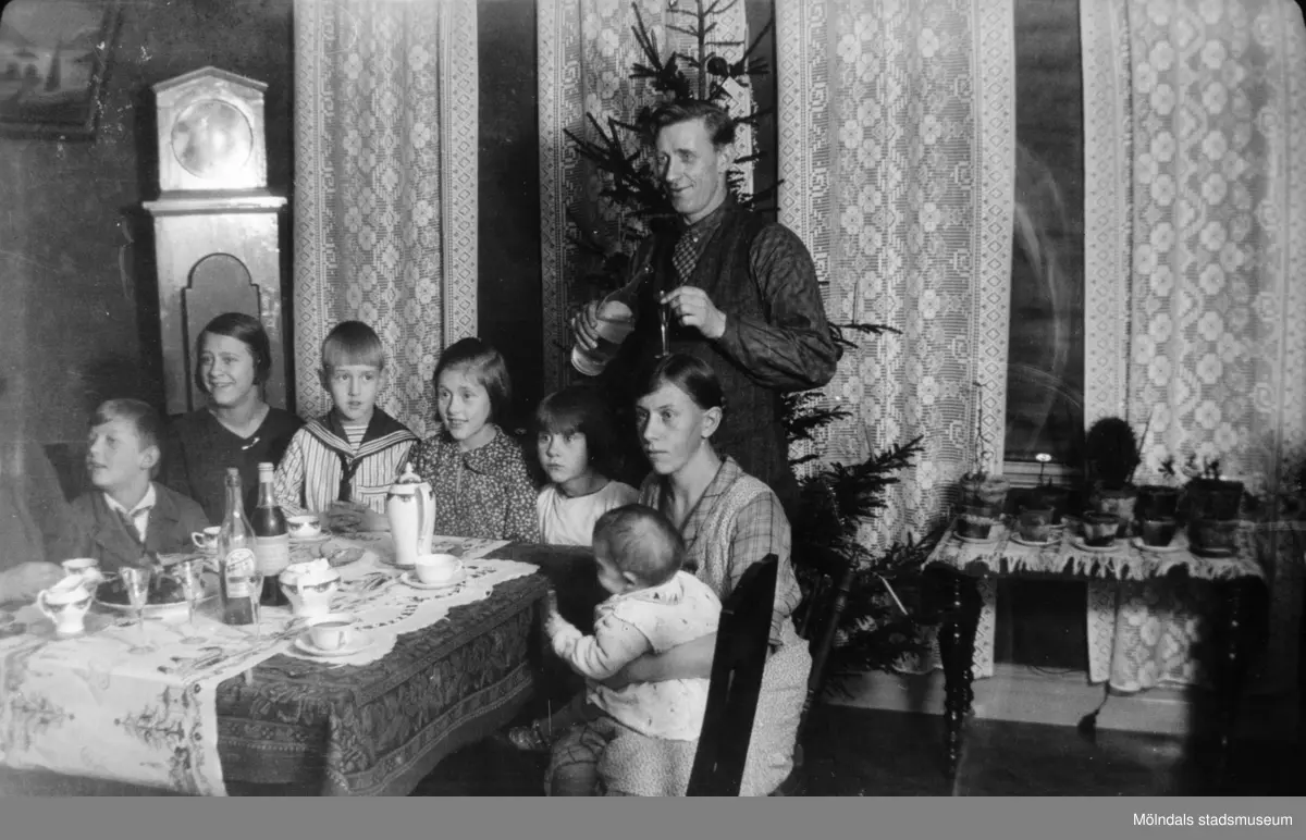 Julafton hemma hos familjen Viktor och Alma Karlsson på Kvarnfallet 31 med släkt. Tidigt 1930-tal. Från vänster: Alf och Rut Zakrisson, syskonen Ivar, Astrid och Margit, modern Alma med Rolf i famnen. Fadern Viktor (morfar till givaren) står upp.