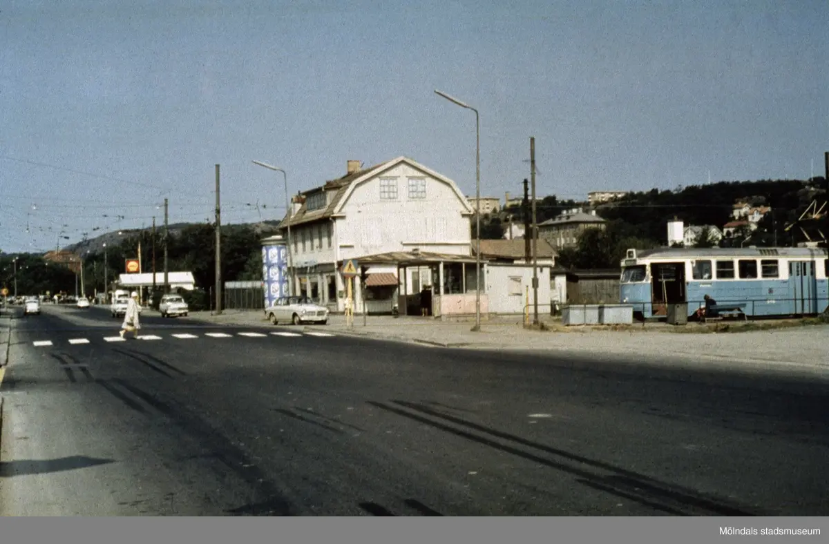 Kungsbackavägen norrut, 1960-tal (vänstertrafik). Till höger ses spårvägens första vändslinga i Mölndal. Den vita byggnaden vid slingan användes som lager till Mölndals möbelaffär vars ägare var Ebbe, Göte och Åke Kristoffersson. Man ser även Pressbyråns kiosk och markis till Bjärendahls Ur- och Optikaffär. Vid vändslingan brukade även ett korvstånd vara placerat. På höjden till höger ses Enerbacken.