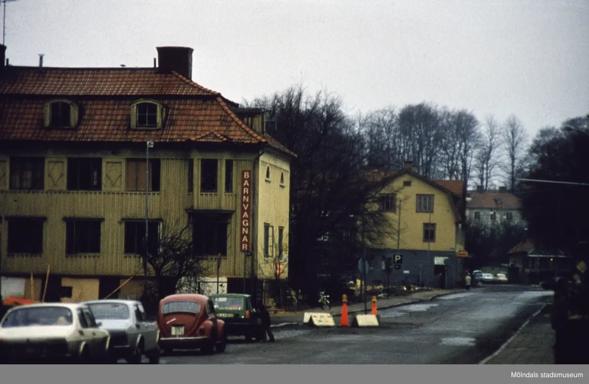 Vy från Frölundagatan (idag: Brogatan) i Mölndal, 1970-tal. Den ljusgrå villan längst bort i bild är länsman Elfvings villa (senare Gustaf Zachrissons) på Frölundagatan 25 A.
