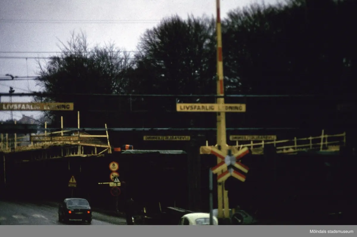 Mölndals Bro under uppförande, år 1975. Några bilar kör på vägen, omgiven av uppresta järnvägsbommar. I bakgrunden till höger ses Papyrus park.
