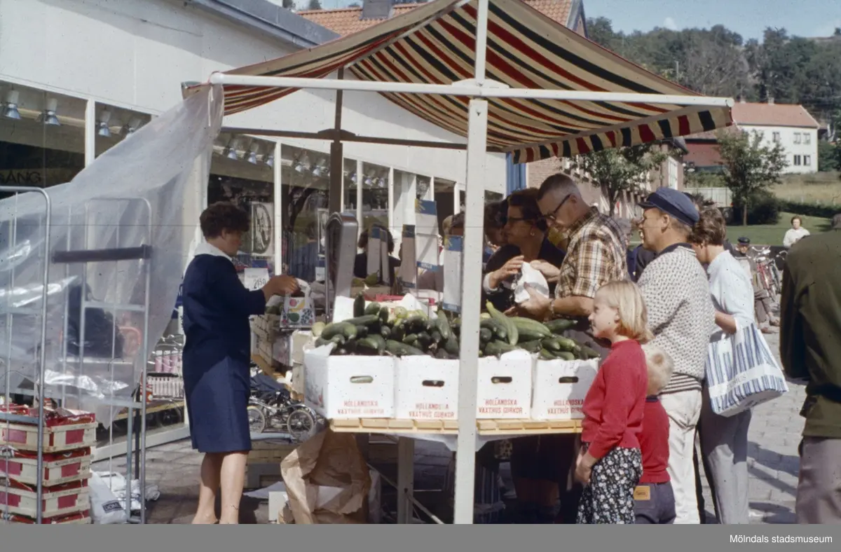 Torghandel utanför Domus affär på Nya Torget i Trädgården, Mölndal, på 1970-talet.