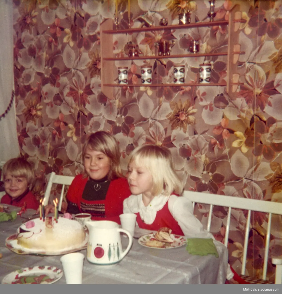 Christine som fyller 6 år har födelsedagskalas i köket på Delbancogatan i Mölndal, 1977.